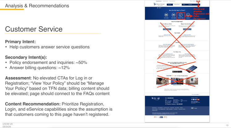 Using a simple A/B experiment, we tested how customers would respond to a page titled Customer Support versus one titles Contact Us. The result was that phone calls were reduced considerably, but customers were still getting confused about which phone number was right for their question — be it a service question, a claims question, or a sales opportunity. This was creating customer friction, and it was also adding additional time and resources as representatives were required to transfer customers from one center to the next, wasting valuable time on both ends of the phone.
