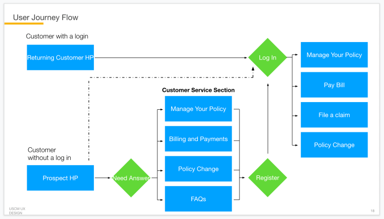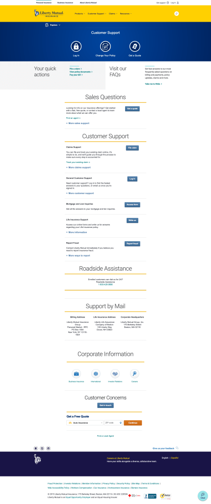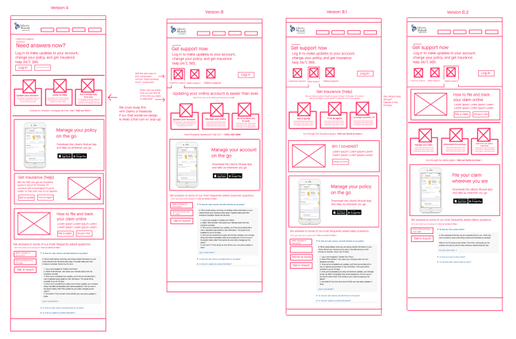 Once again, I led the UX team on exploration of a new support experience, this time sketching low-fi wireframes to visualize the opportunity for our business owners and developers. Leveraging our learnings from previous tests, we broke out each support tier into its own page which gave us the ability to highlight the unique digital capabilities associated with that relevant space. For example, on the Customer Support page we highlighted the mobile app, abilities to manage your policy online, and how customers could enroll in frictionless cost-saving programs like Autopay and Paperless billing. We were also sure to create clear value proposition messaging with direct calls to action into our logged in experience.